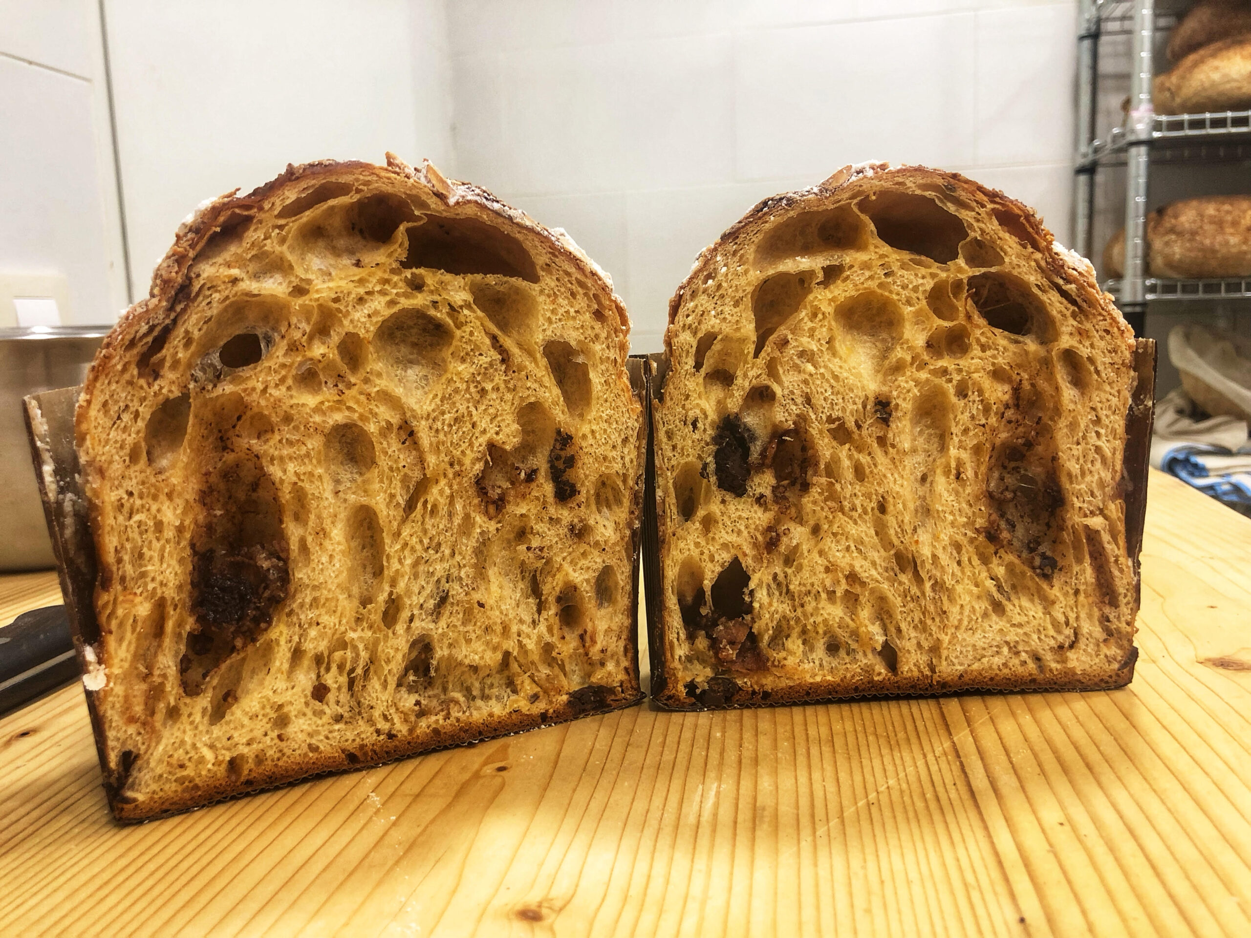 Panettone tradicional hecho con masa madre de cultivo y larga fermentación.