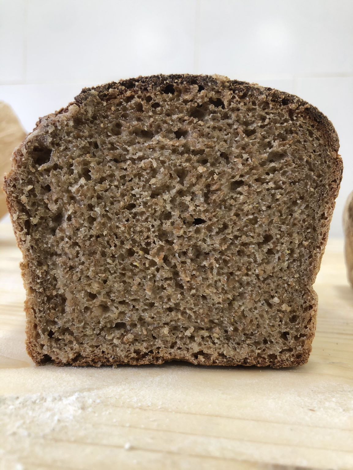 Es un pan 100% de espelta integral con masa madre de cultivo, agua y sal.